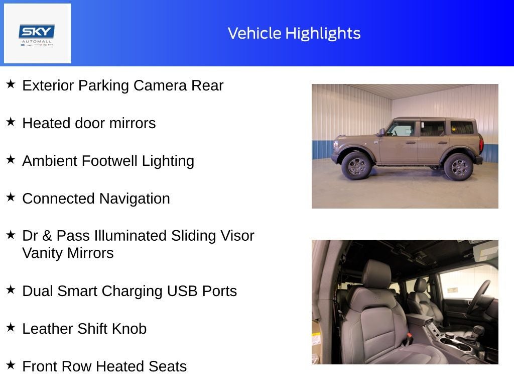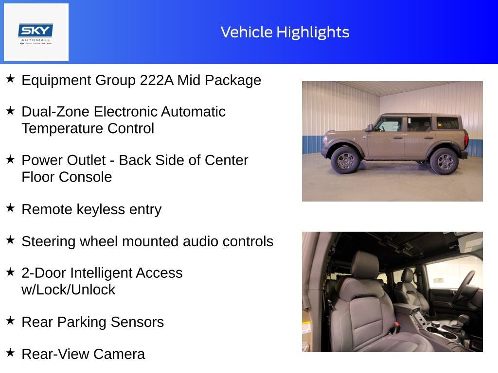 Gray 2025 Ford Bronco Big Bend 4WD 10-Speed Automatic 2.3L EcoBoost I-4 2-Door Intelligent Access w/Lock/Unlock, Alloy wheels, Ambient Footwell Lighting, Connected Navigation, Dr & Pass Illuminated Sliding Visor Vanity Mirrors, Dual Smart Charging USB Ports, Dual-Zone Electronic Automatic Temperature Control, Equipment Group 222A Mid Package, Exterior Parking Camera Rear, Front Row Heated Seats, Heated door mirrors, Leather Shift Knob, Power Outlet - Back Side of Center Floor Console, Rear Parking Sensors, Rear-View Camera, Remote keyless entry, Split folding rear seat, Steering wheel mounted audio controls. Price includes: $2500 - Retail Customer Cash. Exp. 03/31/2026