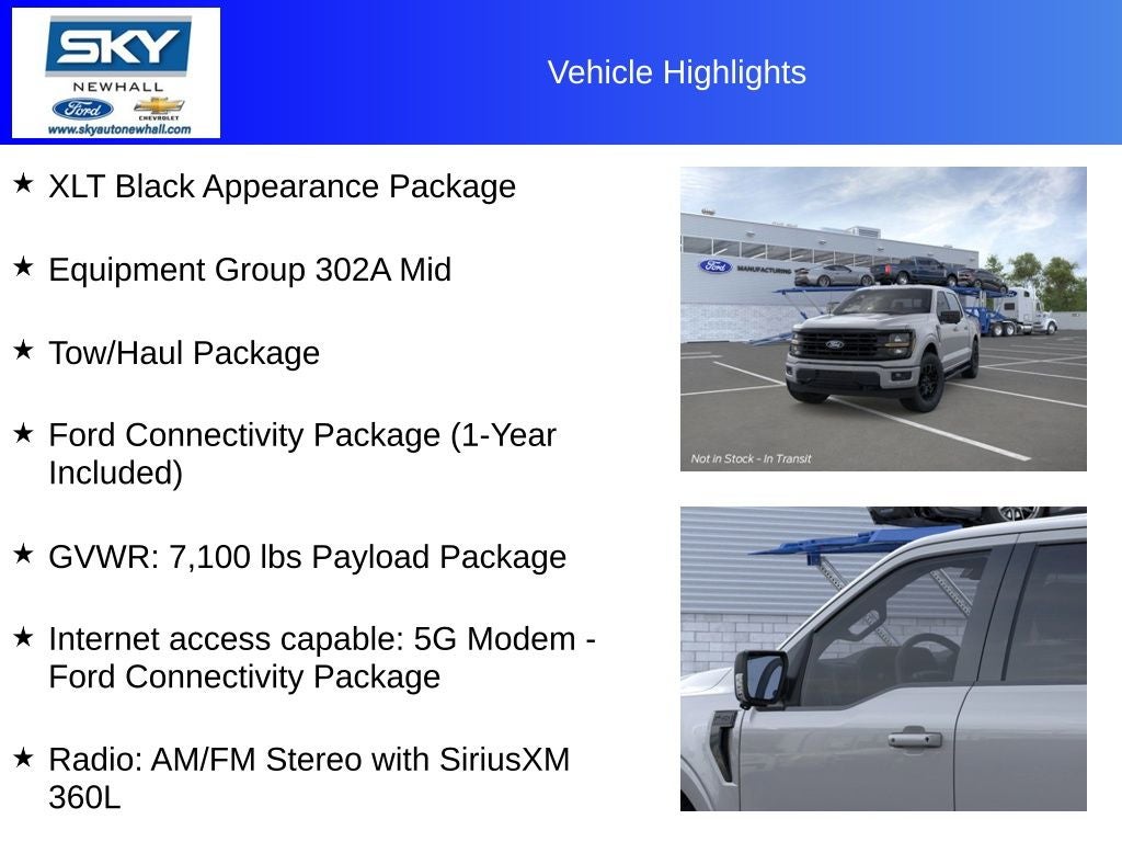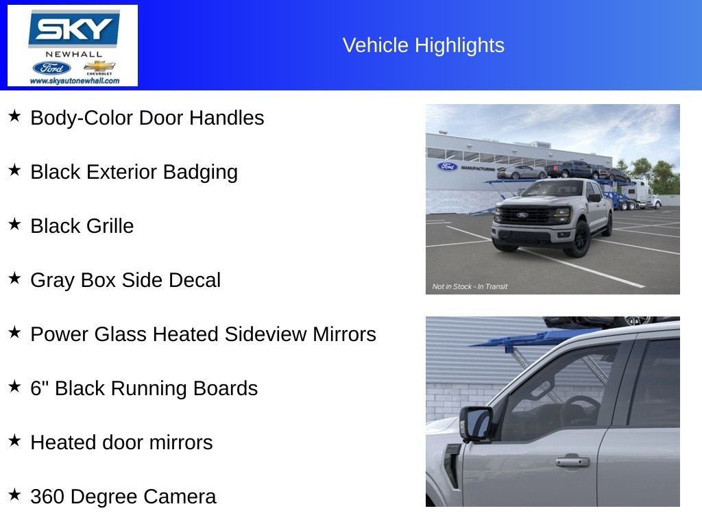 XLT 4WD, 18 Painted Aluminum Wheels, 360 Degree Camera, 400W Pro Power Onboard (cab & Bed), 6 Black Running Boards, Adaptive Cruise Control with Stop and Go, AEB Oncoming, Auto-Dimming Rear-View Mirror, Black Alloy Wheels, Black Exterior Badging, Black Grille, Body-Color Door Handles, Body-Color Front and Rear Bumpers, Brake assist, Chrome Front and Rear Bumpers, Cloth 40/20/40 Front Seat, Dark Interior Appliques, Dual-Zone Electronic Automatic Temperature Control, Equipment Group 302A Mid, Floor Shifter, Ford Co-Pilot360 Assist 2.0, Ford Connectivity Package (1-Year Included), Front Parking Sensors, Gray Box Side Decal, GVWR: 7,100 lbs Payload Package, Heated door mirrors, Heated Front Seats, Integrated Trailer Brake Controller, Intelligent Access with Push Button Start, Internet access capable: 5G Modem - Ford Connectivity Package, Power Glass Heated Sideview Mirrors, Power-Sliding Rear Window, Radio: AM/FM Stereo with SiriusXM 360L, Rear Parking Sensors, Rear window defroster, Remote keyless entry, Remote Start System with Remote Tailgate Release, Split folding rear seat, Steering wheel audio controls, SYNC 4 with Enhanced Voice Recognition, Tow/Haul Package, Towing Technology, Unique Sport Cloth 40/Console/40 Front-Seats, Wheels: 18 Gloss Black, Wrapped Steering Wheel, XLT Black Appearance Package.