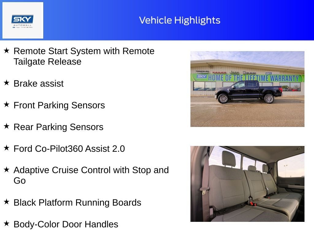 Agate Black Metallic 2026 Ford F-150 XLT 4WD 10-Speed Automatic 3.5L V6 EcoBoost 4WD, 18 Painted Aluminum Wheels, 360 Degree Camera, 400W Pro Power Onboard (cab & Bed), 6 Angular Bright Anodized Step Bar, Adaptive Cruise Control with Stop and Go, AEB Oncoming, Alloy wheels, Auto-Dimming Rear-View Mirror, Black Painted Mesh Grille with Chrome Center Bar, Black Platform Running Boards, Body-Color Door Handles, Brake assist, Chrome Door Handles, Chrome Single-Tip Exhaust, Cloth 40/20/40 Front Seat, Cloth 40/Console/40 Front Seats, Console Worksurface, Dual-Zone Electronic Automatic Temperature Control, Equipment Group 302A Mid, Ford Co-Pilot360 Assist 2.0, Ford Connectivity Package (1-Year Included), Front Parking Sensors, GVWR: 7,100 lbs Payload Package, Heated door mirrors, Heated Front Seats, Integrated Trailer Brake Controller, Intelligent Access with Push Button Start, Internet access capable: 5G Modem - Ford Connectivity Package, Mobile Office Package, Partitioned Lockable Rear Storage, Power Glass Heated Sideview Mirrors, Power-Sliding Rear Window, Radio: AM/FM Stereo with SiriusXM 360L, Rear Parking Sensors, Rear window defroster, Remote keyless entry, Remote Start System with Remote Tailgate Release, Split folding rear seat, Steering wheel mounted audio controls, SYNC 4 with Enhanced Voice Recognition, Tow/Haul Package, Towing Technology, Wheels: 20 Chrome-Like PVD, Wrapped Steering Wheel, XLT Chrome Appearance Package. Discount available on eligible purchases when you finance through a participating preferred lender and trade in a 2016 or newer vehicle with fewer than 75,000 miles. Customers using outside financing or manufacturer special APR programs (including 0%) are not eligible. All financing subject to credit approval and program availability. Offer valid through Exp. 01/31/2030. See dealer for details Discount available on eligible purchases when you finance through a participating preferred lender AND trade in a 2016 or newer vehicle with fewer than 75,000 miles. Customers using outside financing or manufacturer special APR programs (including 0%) are not eligible. All financing subject to credit approval and program availability. Offer valid through Exp. 01/30/2031. See dealer for details