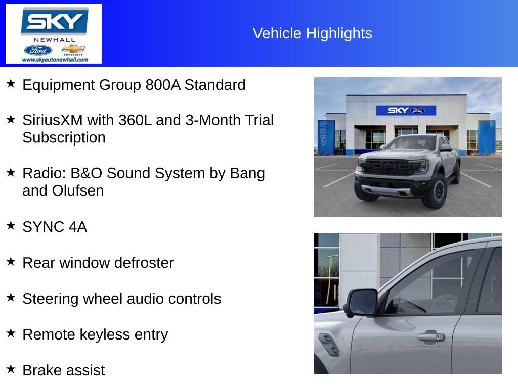 Raptor 4WD, 4.27 Axle Ratio, Black Alloy Wheels, Brake assist, Equipment Group 800A Standard, Heated door mirrors, Heated steering wheel, Leather Shift Knob, Leather steering wheel, Leather-Trimmed Front Heated Bucket Seats, Radio: B&O Sound System by Bang and Olufsen, Rear window defroster, Remote keyless entry, SiriusXM with 360L and 3-Month Trial Subscription, Steering wheel audio controls, SYNC 4A, Wheels: 17 Inch Gray-Painted Aluminum Alloy.