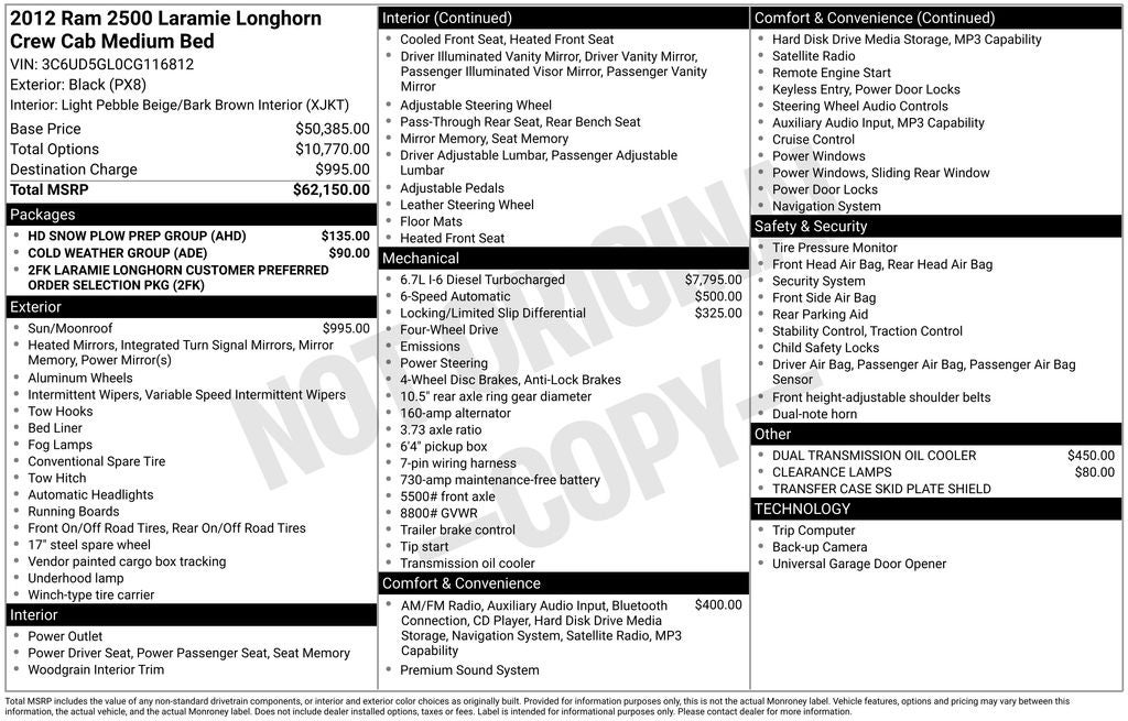 180 Amp Alternator, Black Alloy Wheels, Cold Weather Group, Engine Block Heater, Exterior Parking Camera Rear, HD Snow Plow Prep Group, Heated door mirrors, Heated Front Seats, Heated Second Row Seats, Heated Steering Wheel, Leather steering wheel, Quick Order Package 2FK Longhorn, Remote keyless entry, Steering wheel audio controls, Ventilated Front Seats, Winter Front Grille Cover.