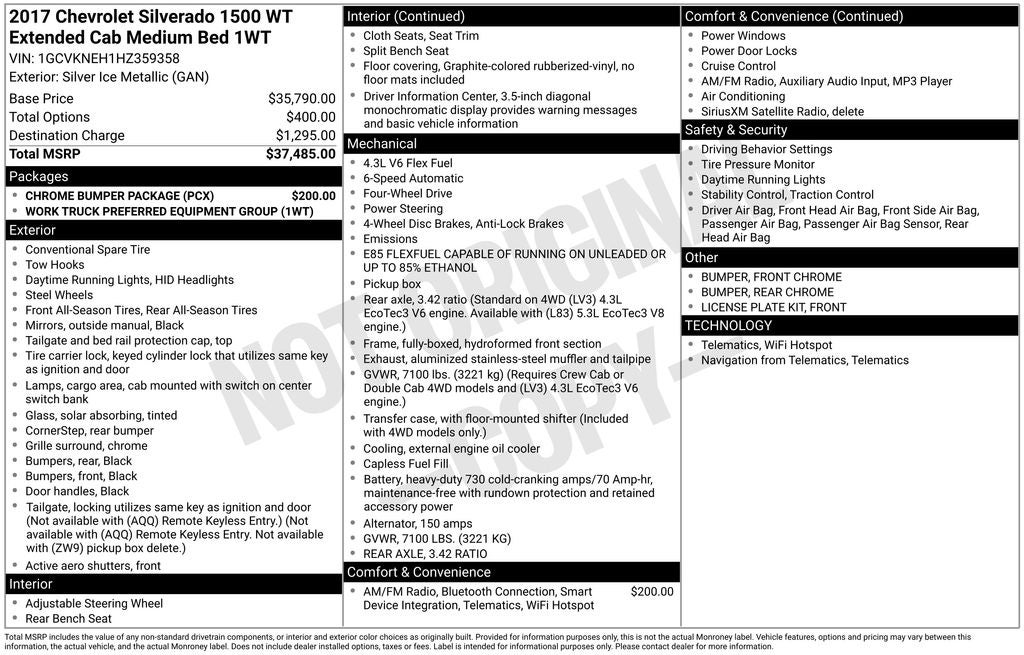 6-Speed Automatic Electronic with Overdrive, 4WD, Dark Ash With Jet Black Interior Accents Cloth, 150 Amp Alternator, 3-Passenger Full-Width Folding Rear Bench Seat, 6 Speaker Audio System, Brake assist, Chrome Bumper Package, Chrome Grille Surround, Driver Information Center, Front Chrome Bumper, Graphite-Colored Rubberized-Vinyl Floor Covering, Manual Tilt Wheel Steering Column, Power Windows w/Driver Express Up, Preferred Equipment Group 1WT, Rear Bumper Cornersteps, Rear Chrome Bumper, Remote Keyless Entry, Remote Locking Tailgate, Solar Absorbing Tinted Glass.