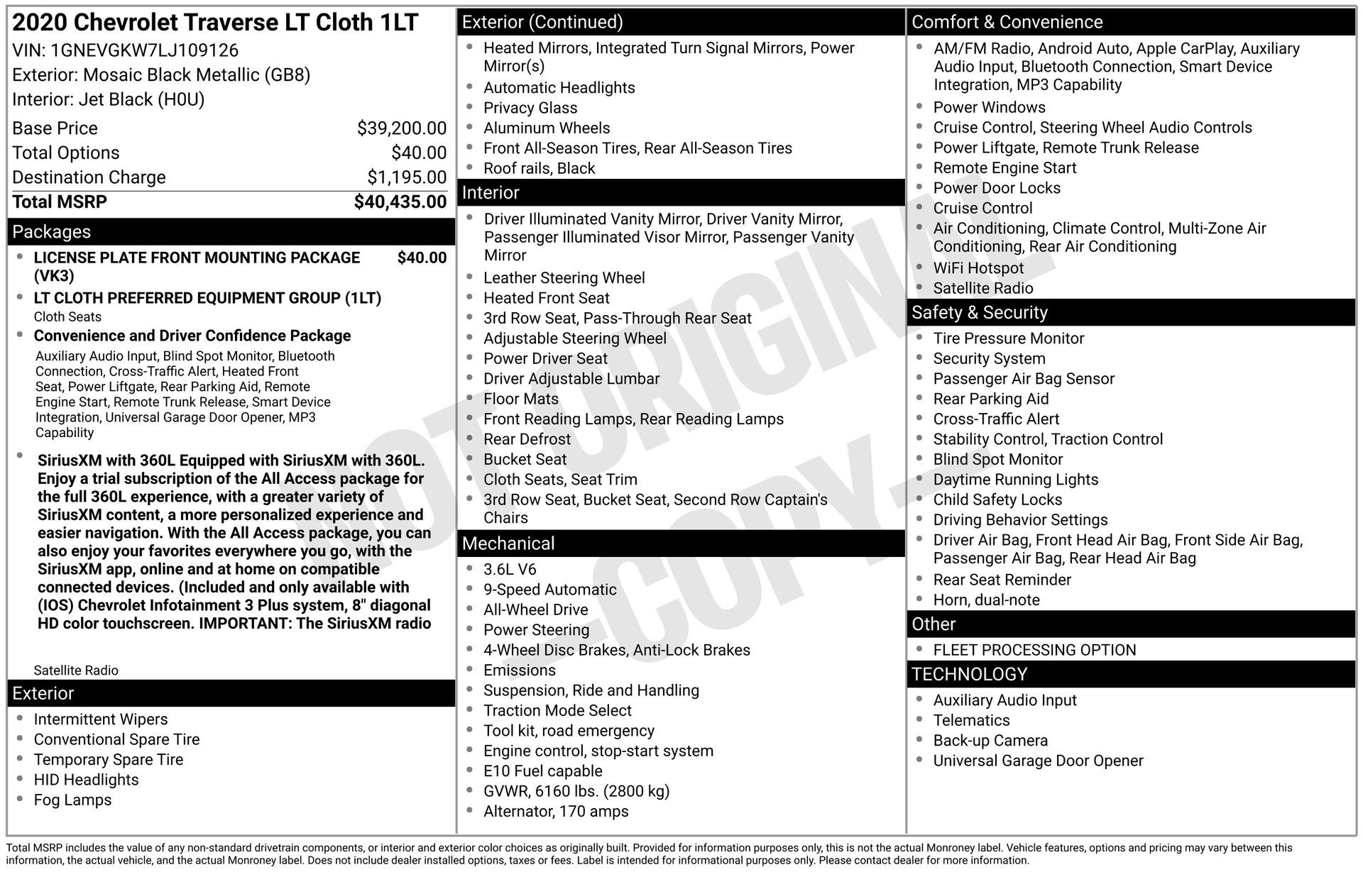 AWD, 3rd row seats: split-bench, Alloy wheels, Apple CarPlay/Android Auto, Brake assist, Front License Plate Bracket Mounting Package, Heated door mirrors, Heated front seats, Leather steering wheel, Preferred Equipment Group 1LT, Rear air conditioning, Rear window defroster, Remote keyless entry, Spoiler, Steering wheel mounted audio controls. Mosaic Black Metallic 2020 Chevrolet Traverse LT 1LT AWD 9-Speed Automatic 3.6L V6 SIDI VVT