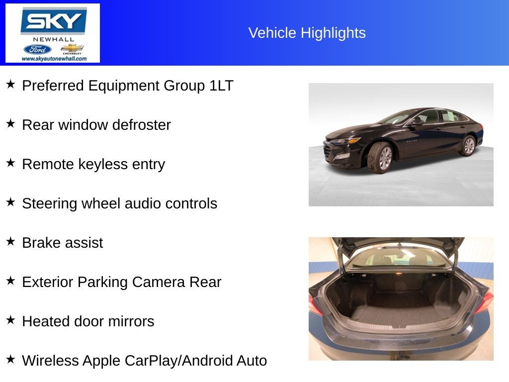 Black Cloth, Black Alloy Wheels, Brake assist, Exterior Parking Camera Rear, Heated door mirrors, Preferred Equipment Group 1LT, Rear window defroster, Remote keyless entry, Split folding rear seat, Steering wheel audio controls, Wireless Apple CarPlay/Android Auto.