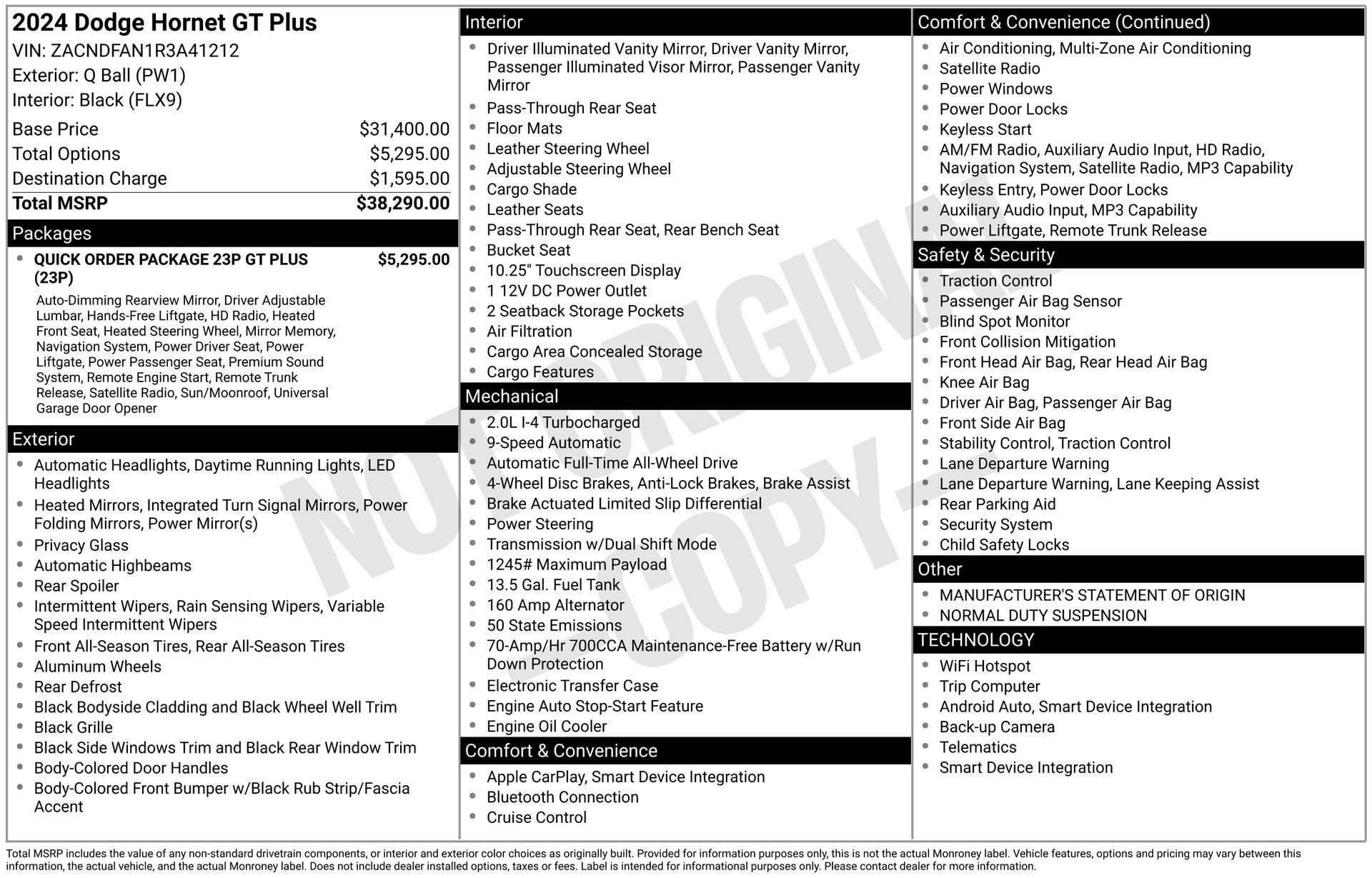10.25 Touchscreen Display, Alloy wheels, Apple CarPlay, Apple CarPlay/Android Auto, Auto-Dimming Rear-View Mirror, Brake assist, Connected Travel & Traffic Services, Connectivity - US/Canada, Disassociated Touchscreen Display, Driver Seat Memory, Google Android Auto, GPS Antenna Input, GPS Navigation, Hands Free Power Liftgate, harman/kardon Premium Audio, HD Radio, Heated door mirrors, Heated Front Seats, Heated Steering Wheel, Integrated Center Stack Radio, Integrated Voice Command w/Bluetooth®, Leather Seats, Leather steering wheel, Mutually Exclusive Package, ParkView Rear Back-Up Camera, Power 4-Way Driver Lumbar Adjust, Power Adjust 8-Way Driver Seat, Power Adjust 8-Way Front Passenger Seat, Power Liftgate, Power Sunroof, Quick Order Package 23P GT Plus, Radio: Uconnect 5 Nav w/10.25 Display, Rear Cargo Shelf Panel, Rear window defroster, Remote keyless entry, Remote Start System, SiriusXM w/360L, Split folding rear seat, Spoiler, Traffic Sign Information, Universal Garage Door Opener, Wireless Charging Pad. Q Ball 2024 Dodge Hornet GT Plus AWD 9-Speed 948TE Automatic 2.0L I4 DOHC