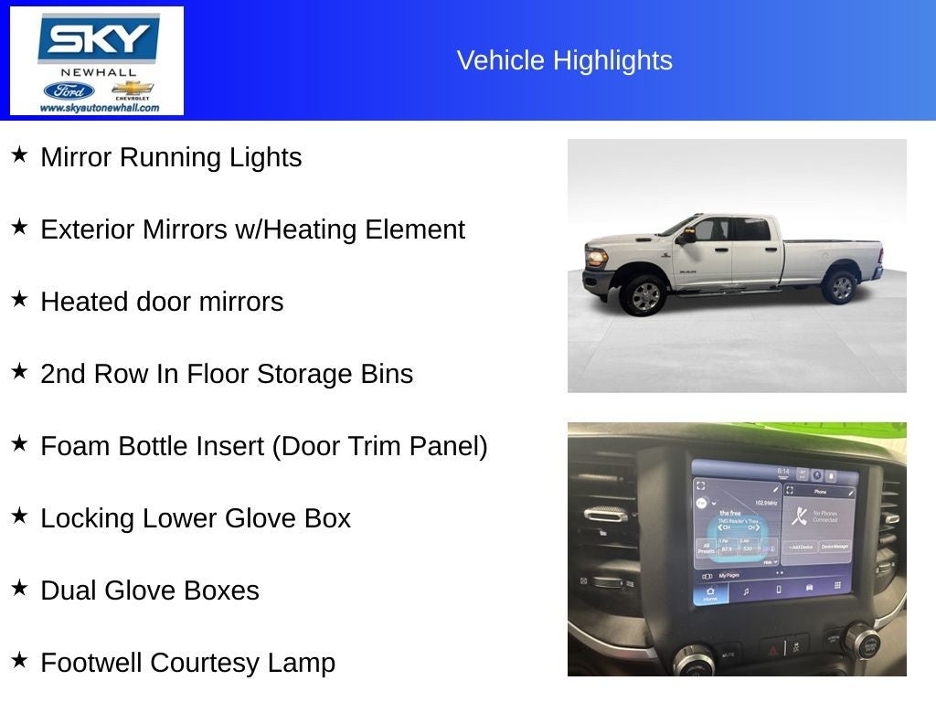 2nd Row In Floor Storage Bins, 4G LTE Wi-Fi Hot Spot, Auto Power-Folding Mirrors, Black Exterior Mirrors, Brake assist, Center Hub, Dual Glove Boxes, Exterior Mirrors Courtesy Lamps, Exterior Mirrors w/Heating Element, Exterior Mirrors w/Supplemental Signals, Foam Bottle Insert (Door Trim Panel), Footwell Courtesy Lamp, Forward & Reverse Utility Lights, Front Fog Lamps, Glove Box Lamp, Heated door mirrors, Leather Wrapped Steering Wheel, Level 1 Equipment Group, Locking Lower Glove Box, Mirror Running Lights, ParkView Rear Back-Up Camera, Power Adjust Mirrors, Power Heated Fold Telescopic Mirrors, Power Telescoping Mirrors, Power-Adjustable Convex Aux Mirrors, Premium Cloth 40/20/40 Bench Seat, Quick Order Package 2HZ Big Horn, Radio: Uconnect 5 w/8.4 Display, Rear Dome w/On/Off Switch Lamp, Remote keyless entry, Steering Wheel Mounted Audio Controls, Wheels: 18 x 8.0 Polished Aluminum.