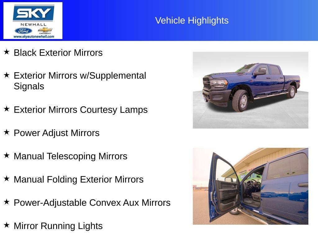 Black Exterior Mirrors, Brake assist, Carpet Floor Covering, Cloth 40/20/40 Bench Seat, Exterior Mirrors Courtesy Lamps, Exterior Mirrors w/Heating Element, Exterior Mirrors w/Supplemental Signals, Manual Folding Exterior Mirrors, Manual Telescoping Mirrors, Mirror Running Lights, ParkView Rear Back-Up Camera, Power Adjust Mirrors, Power Heat Fold Telescopic Mirrors, Power-Adjustable Convex Aux Mirrors, Quick Order Package 2HA Tradesman, Rear Power Sliding Window, Rear Window Defroster, Remote keyless entry, Tradesman Level 2 Equipment Group.