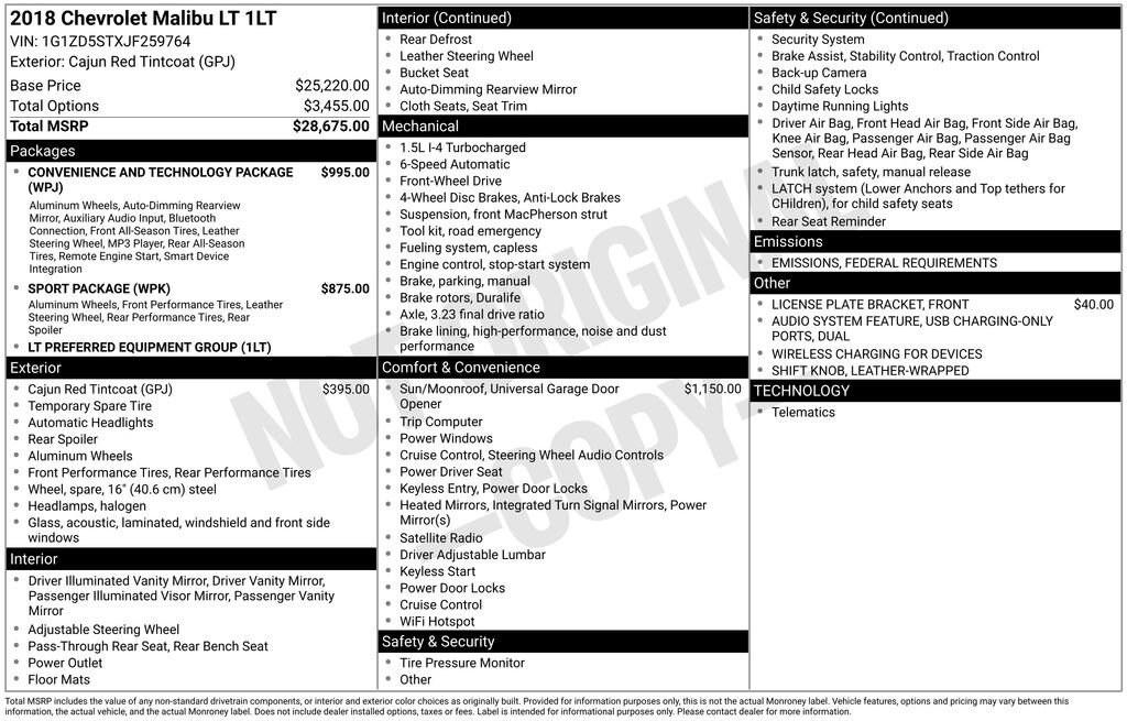 Jet Black Cloth, 120-Volt Power Outlet, 18 Aluminum Wheels, 3-Spoke Leather-Wrapped Steering Wheel, Apple CarPlay/Android Auto, Black Alloy Wheels, Brake assist, Convenience & Technology Package, Driver Information System w/Color Display, Dual USB Charging-Only Ports, Exterior Parking Camera Rear, Heated door mirrors, Inside Rear-View Auto-Dimming Mirror, Leather-Wrapped Shift Knob, Preferred Equipment Group 1LT, Radio: Chevrolet MyLink AM/FM Stereo w/8 Screen, Rear Spoiler, Rear window defroster, Remote keyless entry, Remote Vehicle Starter System, Split folding rear seat, Sport Package (DISC), Steering wheel audio controls, Wireless Charging For Devices.