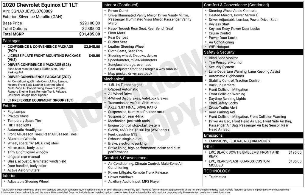 AWD, Apple CarPlay/Android Auto, Black Alloy Wheels, Brake assist, Confidence & Convenience Package, Driver Confidence II Package, Driver Convenience Package, Heated door mirrors, Preferred Equipment Group 1LT, Rear window defroster, Remote Start, Split folding rear seat, Spoiler, Steering wheel audio controls.