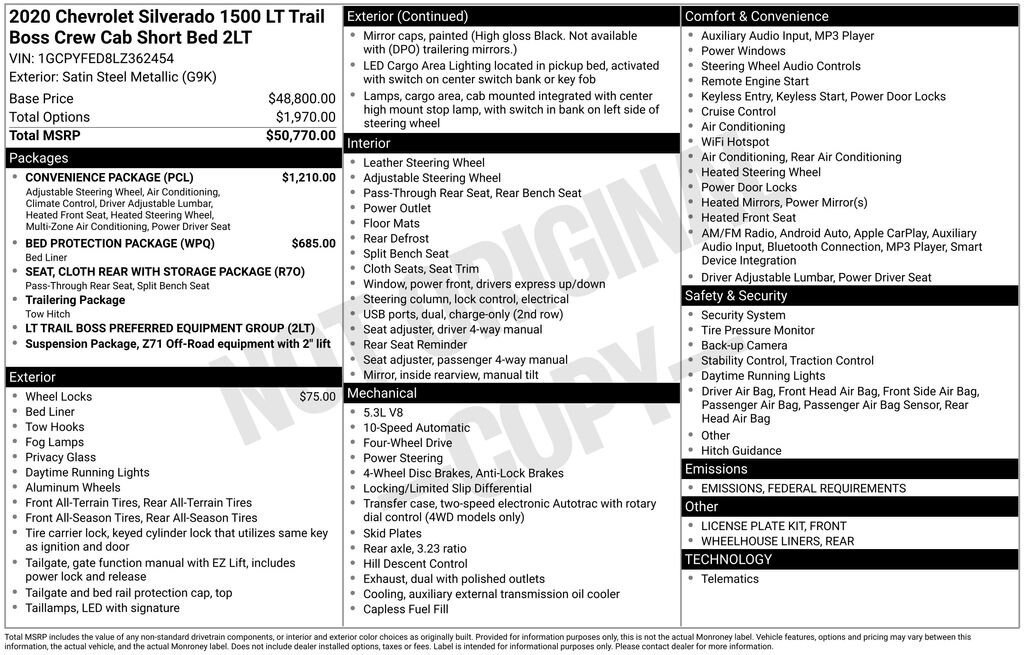 10-Speed Automatic, 4WD, Black Cloth, 10-Way Power Driver Seat w/Lumbar, 12-Volt Rear Auxiliary Power Outlet, 170 Amps Alternator, 2 USB Ports (First Row), 3GCUYDET6LG263470, 4-Way Manual Driver Seat Adjuster, 4.2 Diagonal Color Display Driver Info Center, 4G LTE Wi-Fi Hot Spot Capable, 6-Speaker Audio System, All-Weather Floor Liner (LPO) (AAK), Apple CarPlay/Android Auto, Auxiliary External Transmission Oil Cooler, Bed Protection Package, Black Alloy Wheels, Bluetooth® For Phone, Brake assist, Chevytec Spray-On Black Bedliner, Cloth Rear Seat w/Storage Package, Color-Keyed Carpeting Floor Covering, Compass, Convenience Package, Deep-Tinted Glass, Dual Exhaust w/Polished Outlets, Dual-Zone Automatic Climate Control, Electric Rear-Window Defogger, Electrical Lock Control Steering Column, Front LED Fog Lamps, Heated door mirrors, Heated Driver & Front Outboard Passenger Seats, Heated Steering Wheel, Heavy-Duty Rear Locking Differential, High Gloss Black Grille, High Gloss Black Mirror Caps, Keyless Open & Start, Leather Wrapped Steering Wheel, LED Cargo Area Lighting, LED Reflector Headlamps, Manual Tilt-Wheel Steering Column, Manual Tilt/Telescoping Steering Column, OnStar & Chevrolet Connected Services Capable, Performance Red Recovery Hooks, Power Door Locks, Power Front Windows w/Driver Express Up/Down, Power Front Windows w/Passenger Express Down, Power Rear Windows w/Express Down, Preferred Equipment Group 2LT, Rear 60/40 Folding Bench Seat (Folds Up), Rear Dual USB Charging-Only Ports, Rear Vision Camera, Rear Wheelhouse Liners, Remote keyless entry, Remote Vehicle Starter System, Single-Zone Manual/Semi-Automatic Air Conditioning, Split folding rear seat, Steering wheel audio controls, Steering Wheel Audio Controls, Steering Wheel Mounted Electronic Cruise Control, Suspension Package, Theft Deterrent System (Unauthorized Entry), Trailering Package.