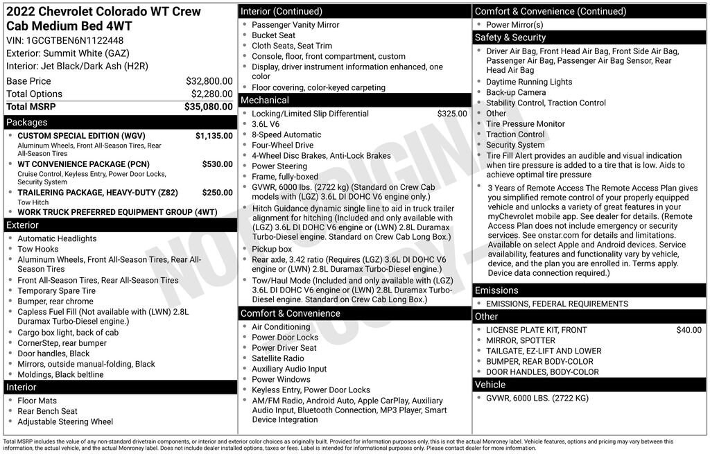 4WD, Apple CarPlay/Android Auto, Body-Color Door Handles, Custom Special Edition, Electronic Automatic Cruise Control, Extended Range Remote Keyless Entry, Exterior Parking Camera Rear, EZ-Lift & Lower Tailgate, Outside Power-Adjustable Body-Color Mirrors, Preferred Equipment Group 4WT, Rear Body-Color Bumper, Remote Locking Tailgate, Spotter Mirror, Trailering Package, Unauthorized Entry Theft-Deterrent System, Wheels: 18 x 8.5 Dark Argent Metallic Cast Alloy, WT Convenience Package.