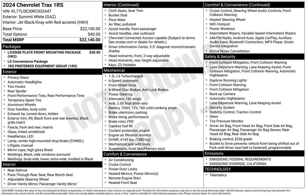 Under the hood, the Trax 1RS is powered by a responsive 1.2L turbocharged engine, delivering a smooth blend of efficiency and fun-to-drive performance. With advanced safety features like Automatic Emergency Braking, Lane Keep Assist, and Forward Collision Alert included as standard, youâll feel confident behind the wheel every time.