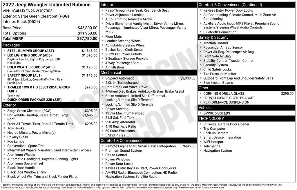 Get ready to experience adventure like never before with this 2022 Jeep Wrangler Unlimited Rubicon. Built for those who crave freedom and exploration, this Wrangler combines rugged capability with modern comfort and style. Its bold, unmistakable design turns heads on every road, while its open-air versatility invites you to take in every moment of the journey from city streets to mountain trails. Inside, youâll find a thoughtfully crafted cabin that blends practicality with premium touches, offering comfort and confidence no matter where your path leads. Whether youâre tackling the toughest terrain or cruising on the highway, the 2022 Wrangler Unlimited Rubicon delivers the perfect balance of power, precision, and pure adventure spirit.