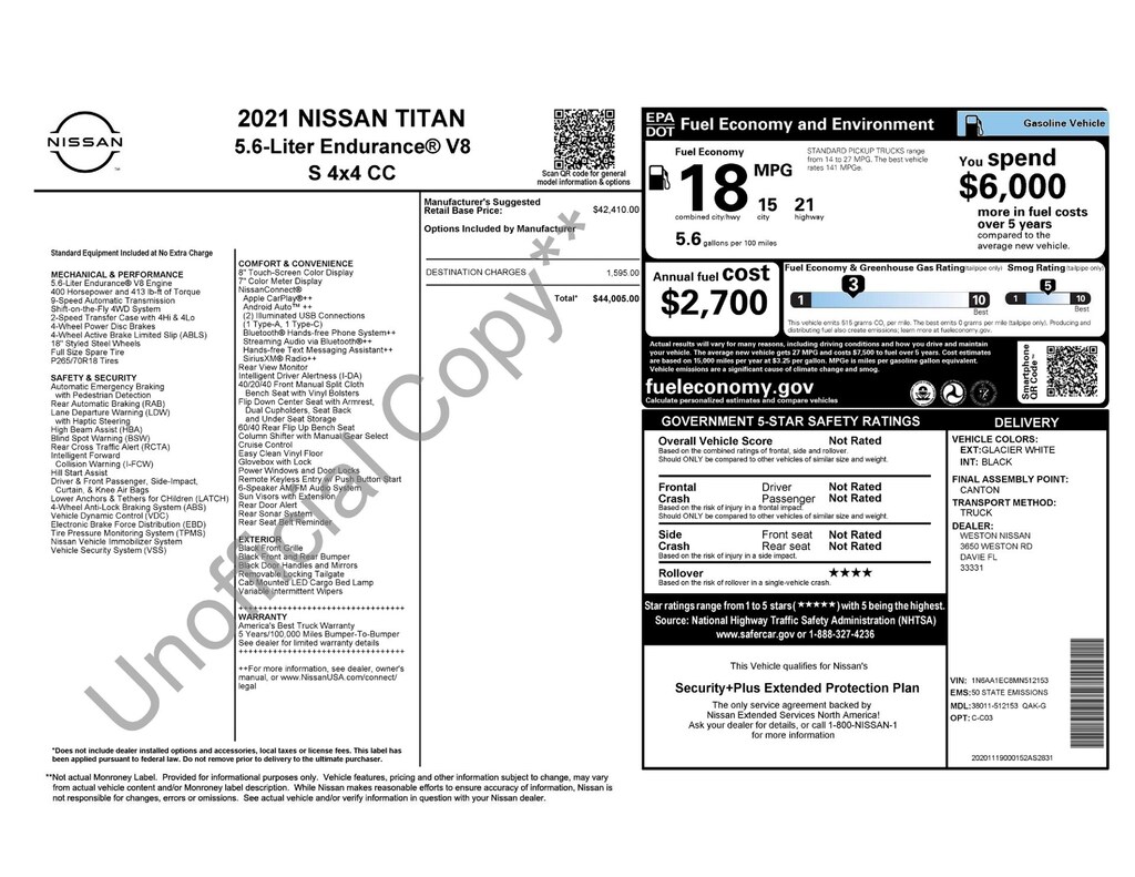 4WD, Blind Spot Warning, Brake assist, Rear Parking Sensors, Rear window defroster, Remote keyless entry, Split folding rear seat, Steering wheel mounted audio controls. Glacier White 2021 Nissan Titan S 4WD 9-Speed Automatic 5.6L V8 DOHC 32V 400hp