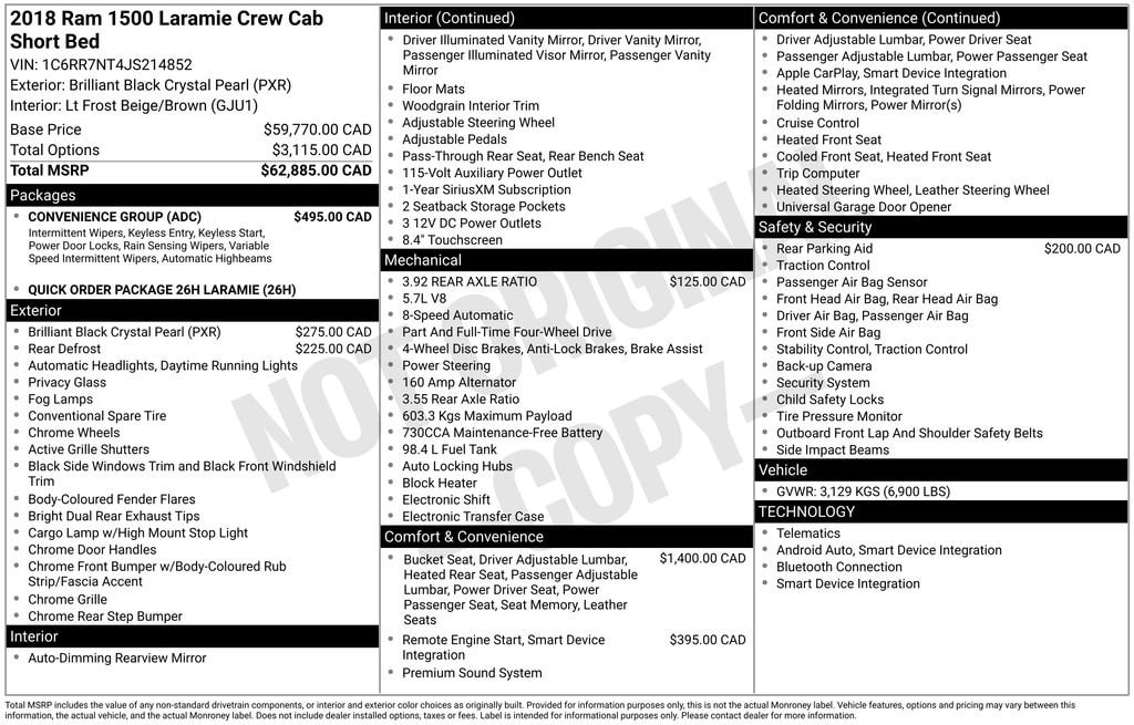 Apple CarPlay/Android Auto, Auto High Beam Headlamp Control, Black Alloy Wheels, Brake assist, Convenience Group, Heated door mirrors, Heated Front Seats, Heated steering wheel, Keyless Enter-N-Go, Leather steering wheel, Leather Trim 40/20/40 Bench Seat, ParkSense Front/Rear Park Assist System, ParkView Rear Back-Up Camera, Quick Order Package 26H Laramie (DISC), Rain Sensitive Windshield Wipers, Rear Window Defroster, Remote keyless entry, Remote Proximity Keyless Entry, Remote Start System, Split folding rear seat, Steering wheel audio controls, Ventilated Front Seats.