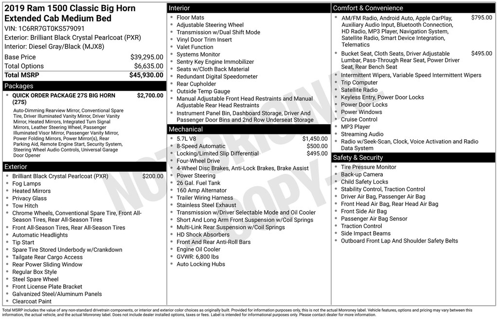 Brilliant Black Crystal Pearlcoat 2019 Ram 1500 Classic Big Horn 4WD 8-Speed Automatic HEMI 5.7L V8 Multi Displacement VVT