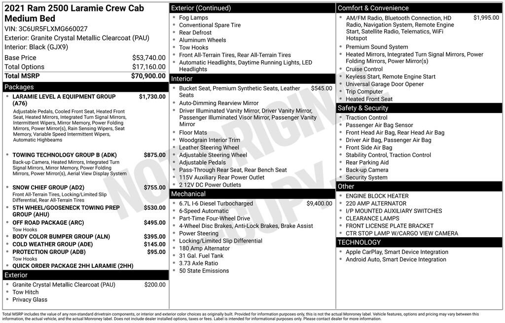 Clean CARFAX.CERTIFIED 12-MONTH/12,000-MILE POWERTRAIN WARRANTY INCLUDEDFREE OIL CHANGES FOR LIFETake on any job or adventure in style with this 2021 Ram 2500 Laramie a heavy-duty truck that blends serious towing power with first-class comfort. Under the hood, youâll find Ramâs legendary strength, ready to haul, tow, and handle whatever the road throws at you.Step inside, and youâll be greeted by a refined interior featuring premium leather-trimmed seats, heated and ventilated front seats, and a 12-inch touchscreen with Uconnect® for seamless navigation, music, and smartphone integration. Every detail is designed for comfort and convenience, from the quiet, well-insulated cabin to the advanced driver-assist technology that keeps you confident on the road.With its bold exterior styling, chrome accents, and rugged capability, the Ram 2500 Laramie isnât just built to work itâs built to impress. Whether youâre towing a trailer, heading off-road, or cruising through town, this truck delivers a smooth, confident ride every time.The 2021 Ram 2500 Laramie is where muscle meets modern luxury perfect for those who demand both strength and sophistication.220 Amp Alternator, 2nd Row In Floor Storage Bins, 4G LTE Wi-Fi Hot Spot, 5th Wheel/Gooseneck Towing Prep Group, Anti-Spin Differential Rear Axle, Apple CarPlay/Android Auto, Auto High Beam Headlamp Control, Black Alloy Wheels, Body Color Bumper Group, Brake assist, Clearance Lamps, Cold Weather Group, CTR Stop Lamp w/Cargo View Camera, Engine Block Heater, Exterior Mirrors w/Memory, Foam Bottle Insert (Door Trim Panel), Front Performance Tuned Shock Absorbers, Heated door mirrors, Heated Front Seats, Hill Descent Control, I/P Mounted Auxiliary Switches, Laramie Level A Equipment Group, Leather steering wheel, Leather Trim 40/20/40 Bench Seat, Mirror-Mounted Aux Reverse Lamps, MOPAR Winter Front Grille Cover, Off Road Decal, Off Road Package, Off-Road Information Pages, Painted Front Bumper, Painted Rear Bumper, ParkView Rear Back-Up Camera, Power Adjustable Convex Aux Mirrors, Power Adjustable Pedals w/Memory, Power Chrome Tow Mirrors w/Convex Spotter & Memory, Protection Group, Quick Order Package 2HH Laramie, Radio/Driver Seat/Mirrors/Pedals Memory, Rain Sensitive Windshield Wipers, Rear Performance Tuned Shock Absorbers, Rear window defroster, Remote keyless entry, Remote Tailgate Release, Snow Chief Group, Split folding rear seat, Steering wheel audio controls, Surround View Camera System, Tow Hooks, Towing Technology Group B, Trailer Reverse Guidance, Ventilated Front Seats.