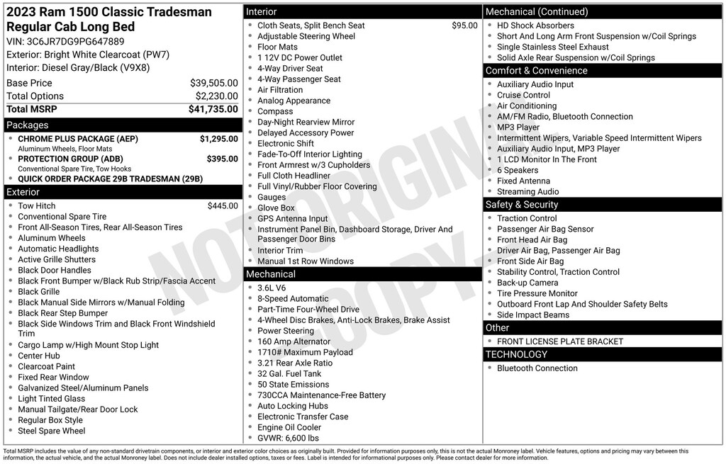17" x 7" Aluminum Wheels, Brake assist, Bright Front Bumper, Bright Grille, Bright Rear Bumper, Carpet Floor Covering, Chrome Plus Package, Cloth 40/20/40 Bench Seat, ParkView Rear Back-Up Camera, Protection Group, Quick Order Package 29B Tradesman, Tow Hooks, Tradesman Package.