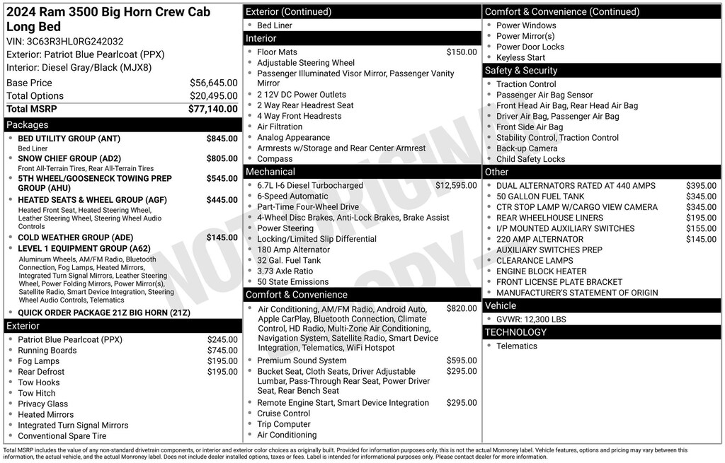 2nd Row In Floor Storage Bins, 4G LTE Wi-Fi Hot Spot, 5th Wheel/Gooseneck Towing Prep Group, Auto Power-Folding Mirrors, Auxiliary Switches Prep, Bed Utility Group, Black Exterior Mirrors, Brake assist, Center Hub, Clearance Lamps, Cold Weather Group, Dual Glove Boxes, Engine Block Heater, Exterior Mirrors Courtesy Lamps, Exterior Mirrors w/Heating Element, Exterior Mirrors w/Supplemental Signals, Foam Bottle Insert (Door Trim Panel), Footwell Courtesy Lamp, Forward & Reverse Utility Lights, Front Fog Lamps, Glove Box Lamp, Heated door mirrors, Heated Front Seats, Heated Seats & Wheel Group, Heated Steering Wheel, I/P Mounted Auxiliary Switches, Leather Wrapped Steering Wheel, LED Bed Lighting, Level 1 Equipment Group, Locking Lower Glove Box, Mirror Running Lights, MOPAR Deployable Bed Step, MOPAR Spray In Bedliner, MOPAR Winter Front Grille Cover, ParkView Rear Back-Up Camera, Power Adjust Mirrors, Power Heated Fold Telescopic Mirrors, Power Telescoping Mirrors, Power-Adjustable Convex Aux Mirrors, Premium Cloth 40/20/40 Bench Seat, Quick Order Package 21Z Big Horn, Radio: Uconnect 5 w/8.4" Display, Rear Dome w/On/Off Switch Lamp, Rear Window Defroster, Remote keyless entry, Remote Start System, Snow Chief Group, Steering Wheel Mounted Audio Controls, Wheels: 18" x 8.0" Polished Aluminum.