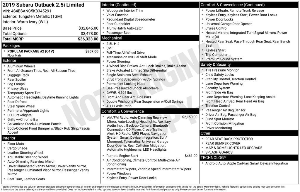 When our Honda CRV was totaled by an idiot in a pick up truck, we started shopping around. We examined all the other alternatives from Ford, GM, Honda, Toyota, Nissan, Hyundai, but it was when the Outback was taken for a test drive it IMMEDIATLY set itself apart from its competitors! Road noise, minimal; interior comfort, OUTSTANDING; road handling, a dream; electronics, mind-blowing array including safety systems; ALSO, and you cannot find this on ANY 2019 SUV in it's class, a CD PLAYER in addition to the satellite and broadcast radio! Yep, a physical real CD player, which means we don't have to put all our music on USB sticks! Ours is the 4 cylinder model, but even still, when you kick down on the accelerator (not the paddle switch on the steering wheel) it can deliver some very impressive acceleration! The back is absolutely cavernous compared to its competition, even before you put the rear seats in a down position! The array of controls available on the steering wheel is impressive to say the least, and will take a bit of learning to get fully comfortable with. When you consider ALL of the standard features, including safety features, that are extra on most of its competition, together with how the vehicle itself performs, this really is a no brainer! Detroit has a LOT of catching up to do, & mainstream Japan automakers, while maybe having the same technology, don't even come close to this level of appointments as standard at this price point!… - 5.0